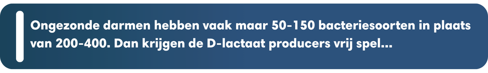 Een gezond darmstelsel met een goede spijsvertering bevat ongeveer 200-400 unieke bacteriesoorten, met ieder een specifieke taak. De ene produceert energie, de andere verwerkt voedsel of toxines... En het allerbelangrijkste: de juiste bacteriesoorten verdringen D-lactaat producerende bacteriën en verminderen zo de klachten.