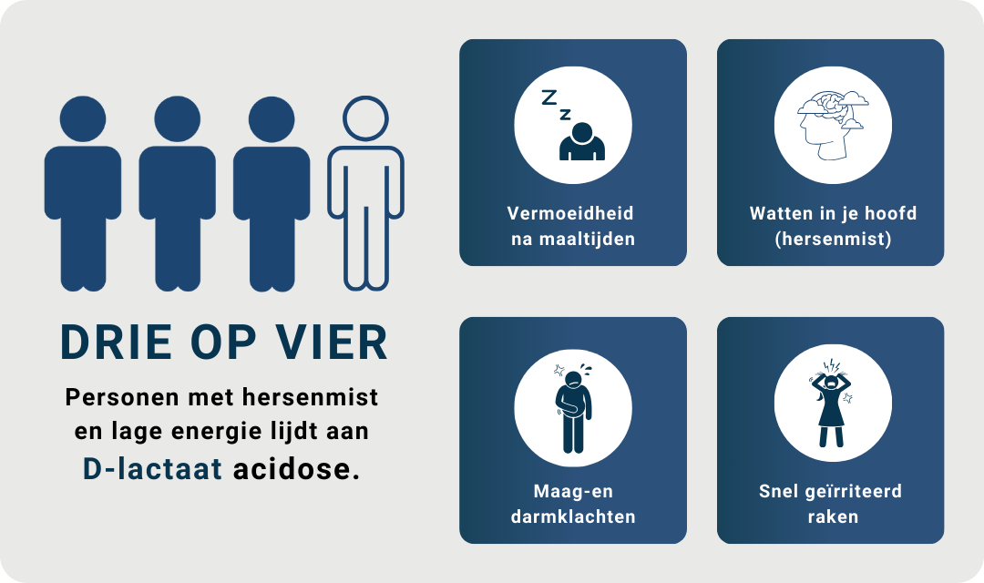 *Gebaseerd op onderzoek van Rao et al. (2018), waarin 77% van de patiënten met brain fogginess en darmklachten tekenen van D-lactaatacidose vertoonde. Resultaten niet bevestigd voor algemene bevolking.