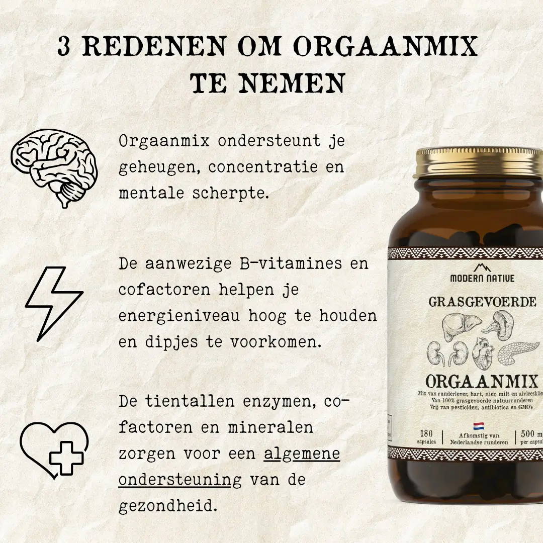 Omdat het nemen van orgaansupplementen vergelijkbaar is met het eten van orgaanvlees, hoef je niet bang te zijn voor overdosering. Daarnaast zijn onze supplementen zo ontworpen, dat ze samen kunnen worden ingenomen.