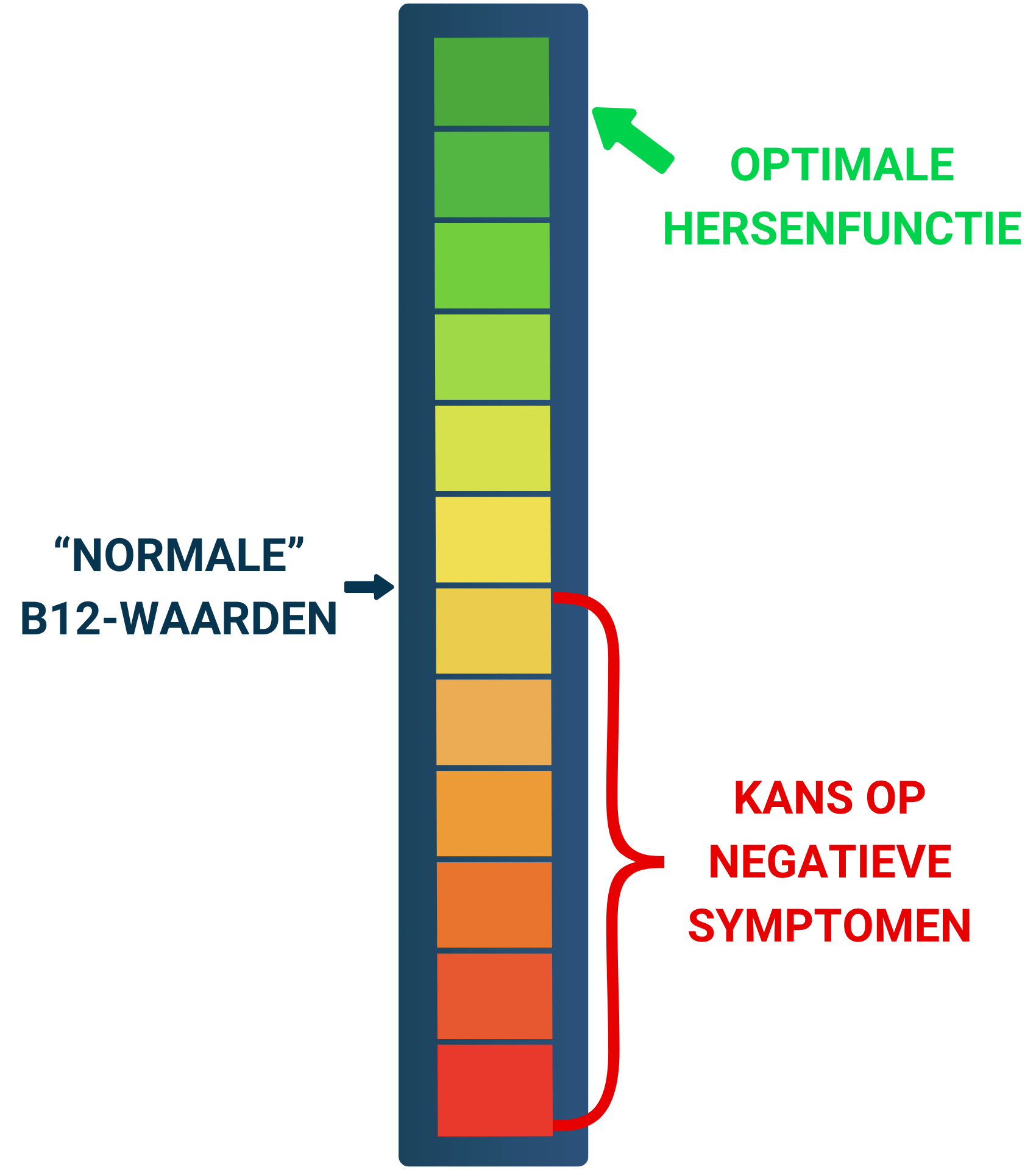 In deze situatie kan je namelijk een suboptimale hoeveelheid B12 in je bloed hebben. Op bloedtests kan je binnen normale referentiewaarden voor B12 vallen, maar zelfs dan kan je nog tekenen ervaren die in studies in verband zijn gebracht met suboptimale B12-waarden.
