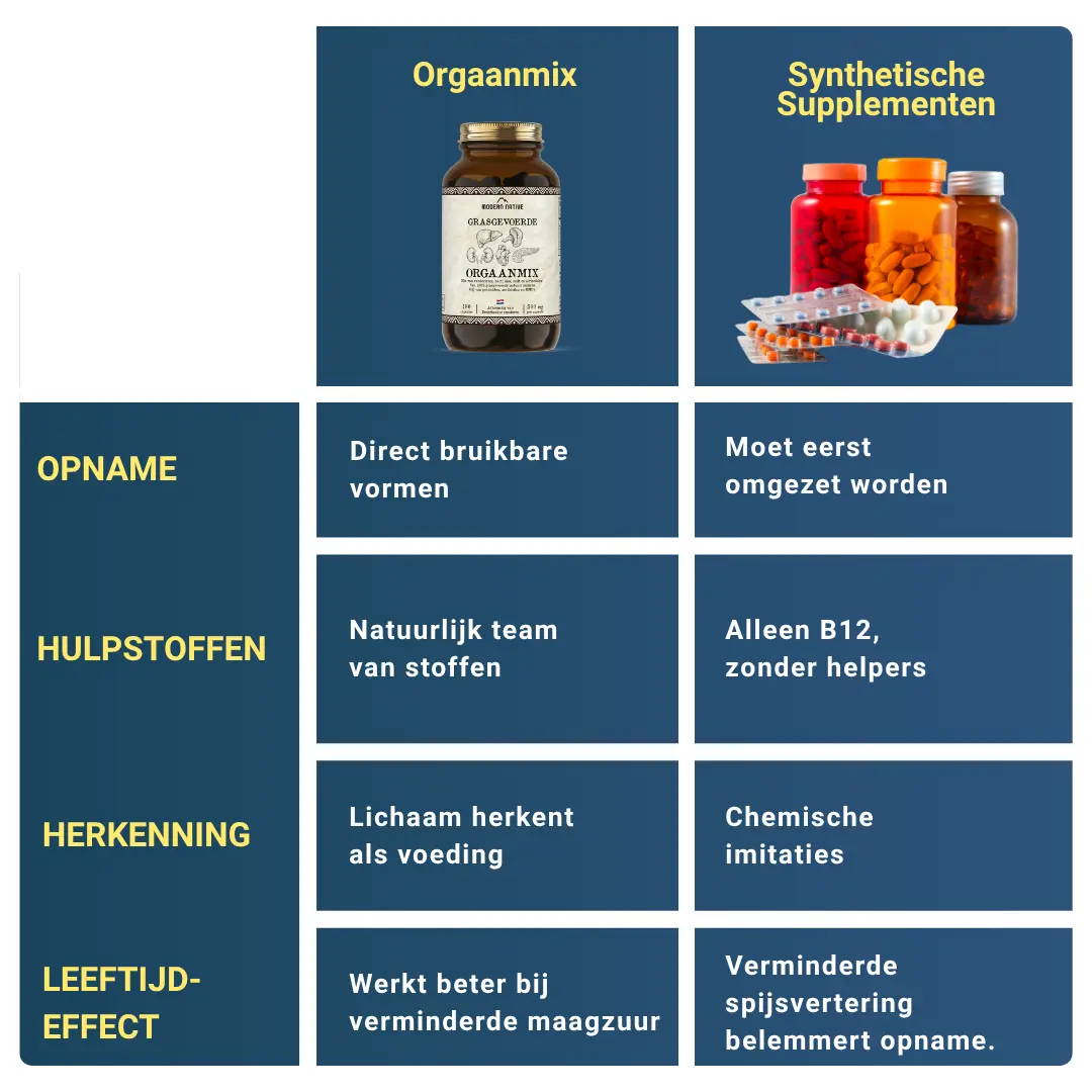 Met natuurlijke voedingsbronnen zoals Orgaanmix krijg je niet één geïsoleerde vitamine, maar een compleet spectrum aan hersenvitamines, mineralen en co-factoren die samenwerken - precies zoals de natuur het bedoeld heeft.