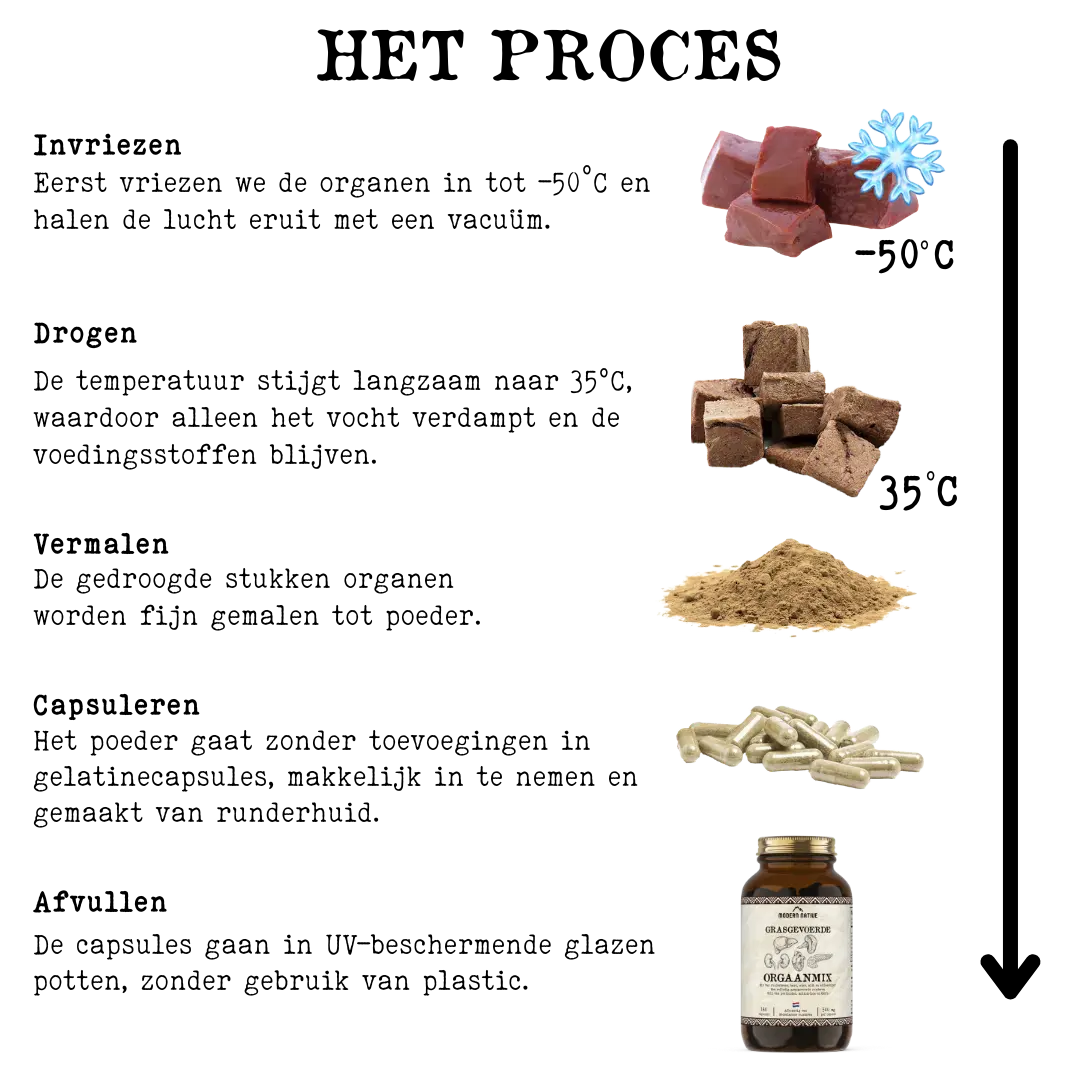 De ingrediënten van onze supplementen zijn afkomstig van volledig grasgevoerde runderen uit Nederland. Doordat de koeien op natuurlijk grasland worden gehouden en goed worden verzorgd, worden de voedingstoffen optimaal behouden en krijg je hoogwaardiger orgaanvlees.